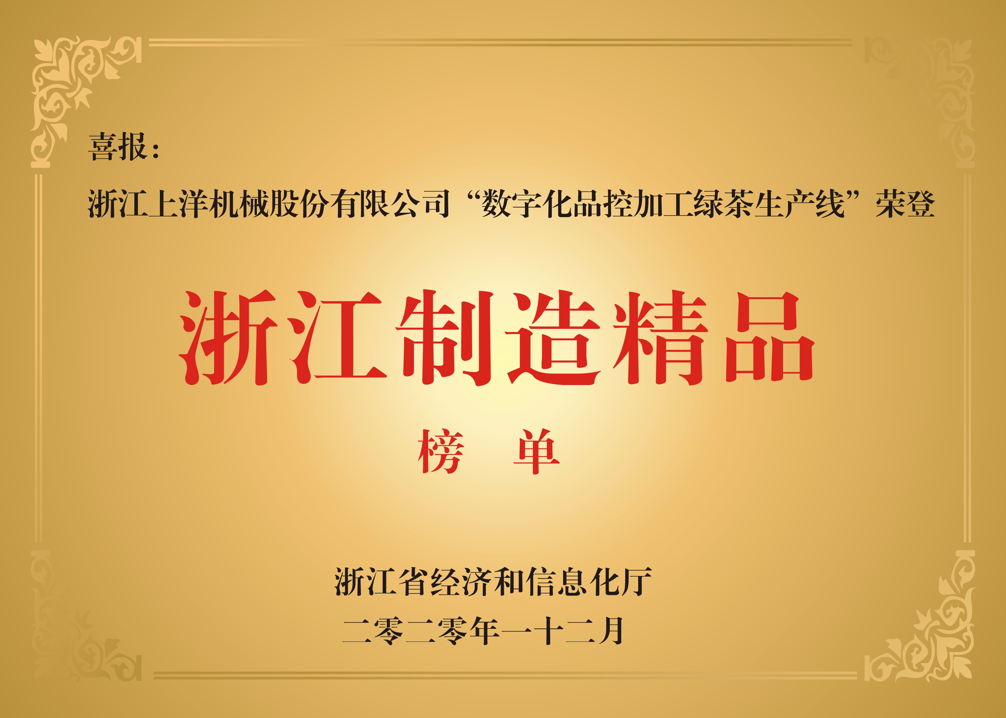 2020年數字化品控綠茶生產線榮登浙江制造精品榜單