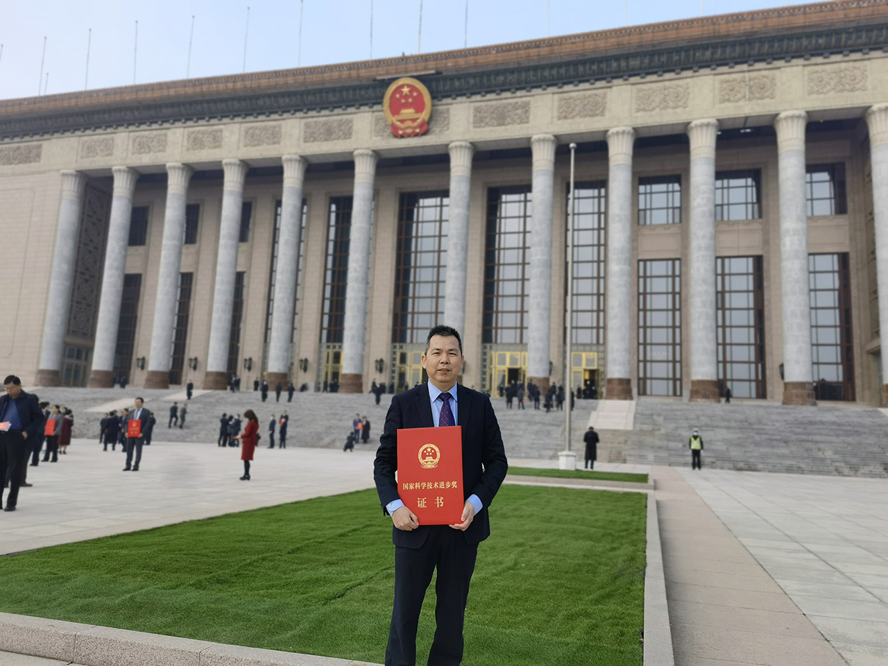 11月3日,浙江上洋機(jī)械股份有限公司總經(jīng)理黃劍虹手捧獲獎(jiǎng)證書(shū)在北京人民大會(huì)堂門口拍照留影——公司與安徽農(nóng)業(yè)大學(xué)等單位聯(lián)合申報(bào)的《綠茶自動(dòng)化加工與數(shù)字化品控關(guān)鍵技術(shù)裝備及應(yīng)用》獲得國(guó)家科學(xué)技術(shù)進(jìn)步獎(jiǎng)二等獎(jiǎng)!
